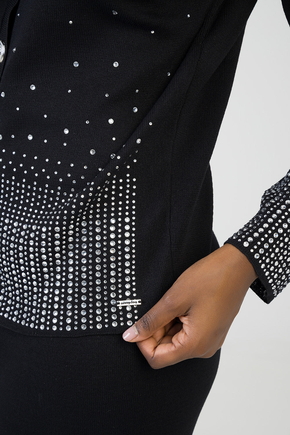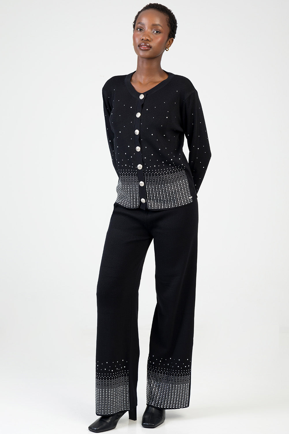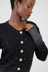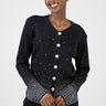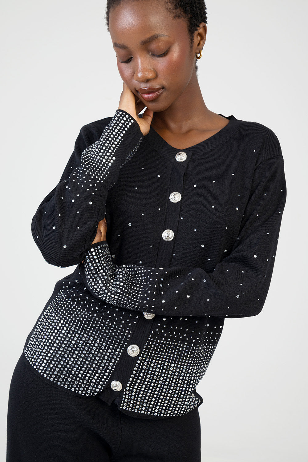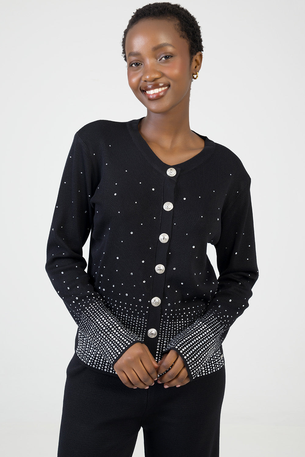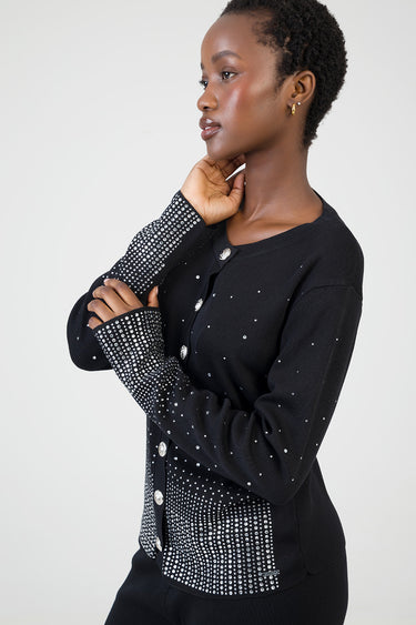 Elegant knit cardigan detailed with shimmering rhinestones in a gradient design. Features a round neckline, statement buttons and long sleeves. A chic layering piece that adds subtle sparkle to any look.
