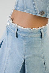 The Nicole Pleated Denim Skirt combines playful femininity with a modern edge. Designed with a flattering mini length, sharp pleats and delicate lace trim at the waist, it adds a soft, romantic touch to structured denim. Complete the look with the Nicole Denim and Lace Halter Neck Top for a coordinated statement.
