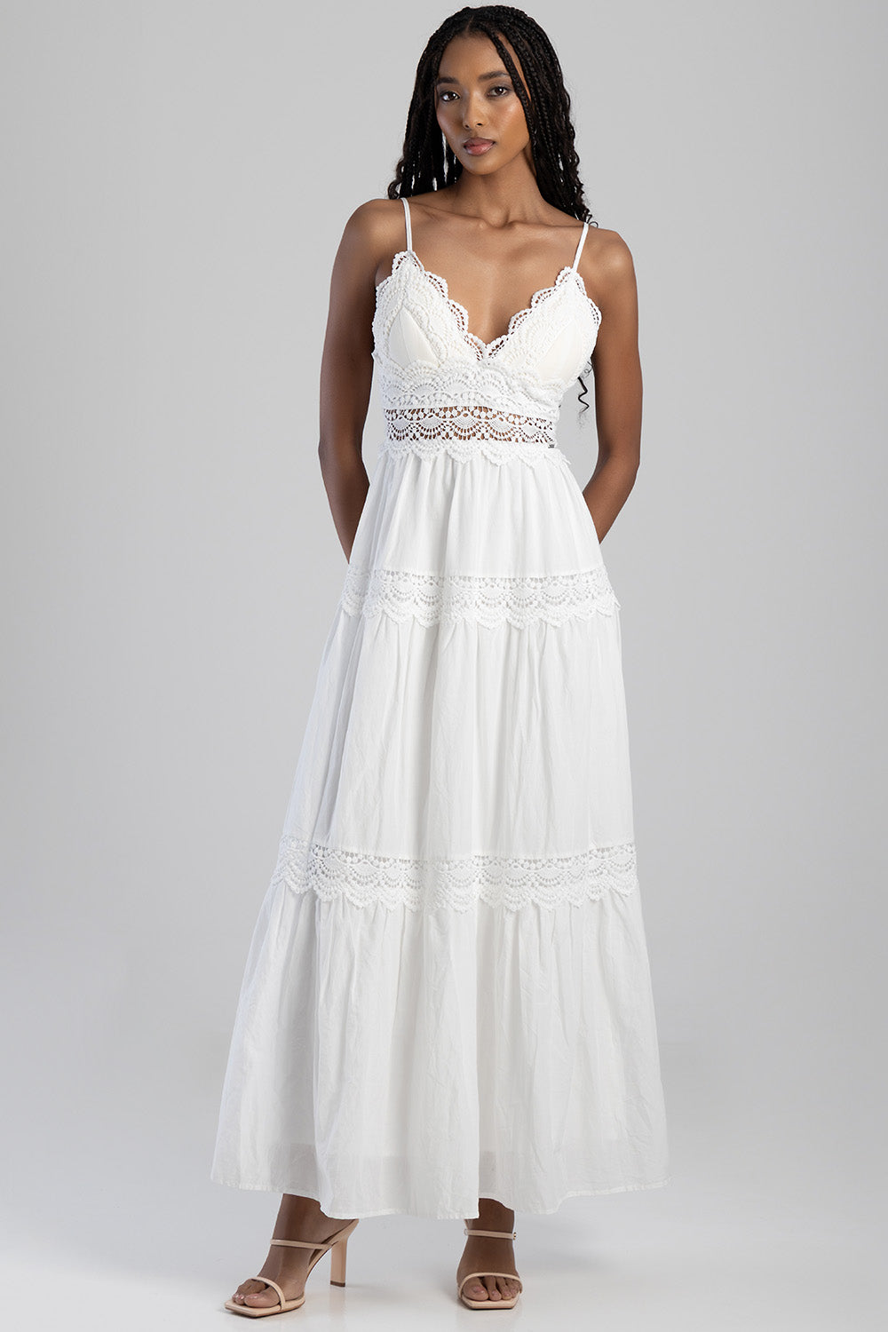 This tiered lace maxi dress is a stunning and feminine choice. The white color is both elegant and versatile, while the tiered design adds a touch of movement and dimension. The maxi length creates a flattering and romantic silhouette.