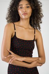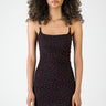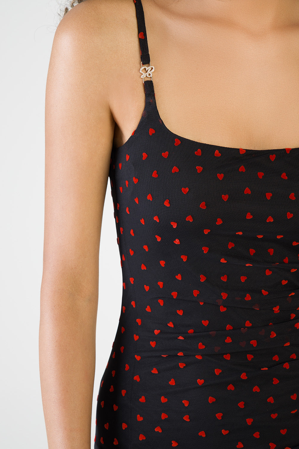 A refined statement piece designed to highlight the silhouette with ease. This mini dress features a classic scoop neckline with slim shoulder straps, finished with subtle metal detailing for a modern touch. Crafted from lightweight stretch mesh, the fully ruched construction sculpts the body while adding depth and texture. The all-over heart print introduces a soft, romantic contrast, balanced by a clean mini length for a confident, contemporary finish. Perfect for evening styling and elevated after-dark occasions.