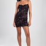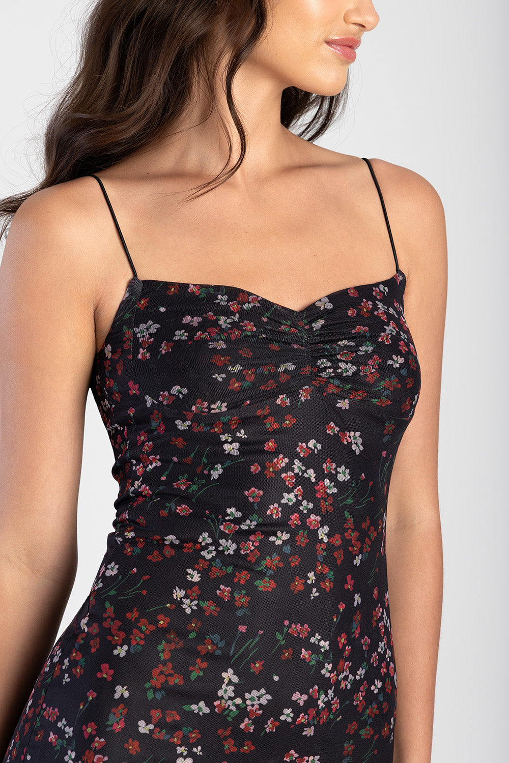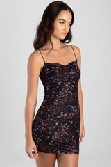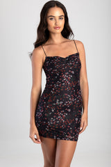 Always Present is a mini dress featuring an underbust cutline and delicate ruching details. Covered in red and white floral prints, it exudes charm and adds a vibrant touch to any occasion.