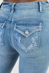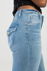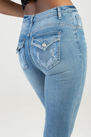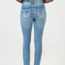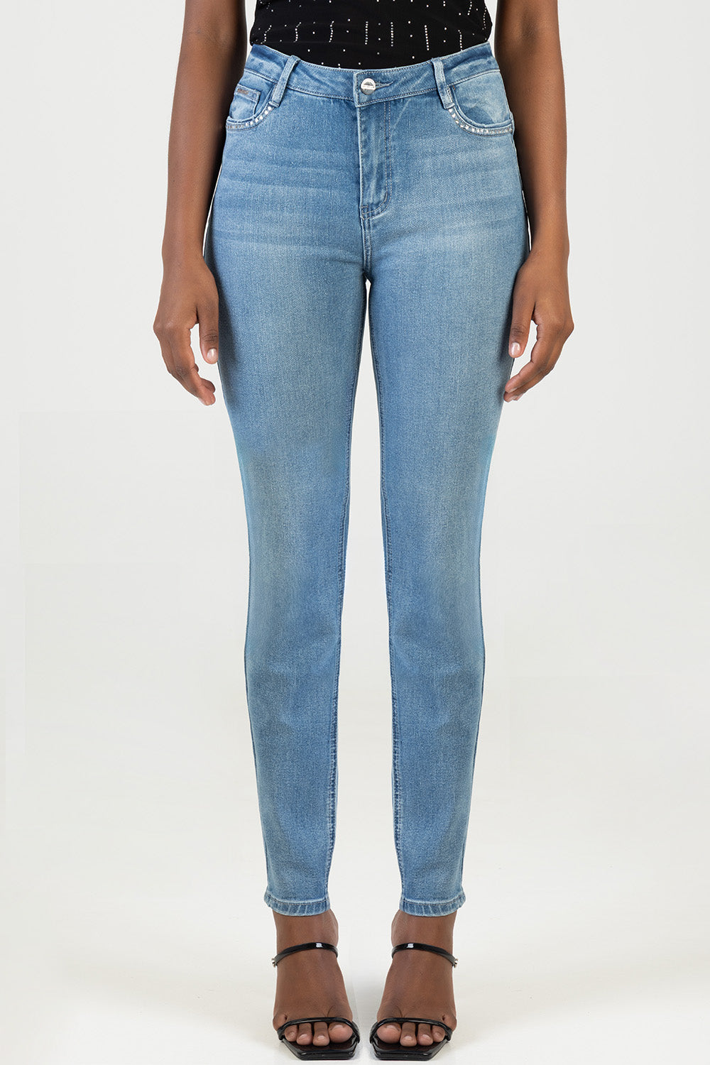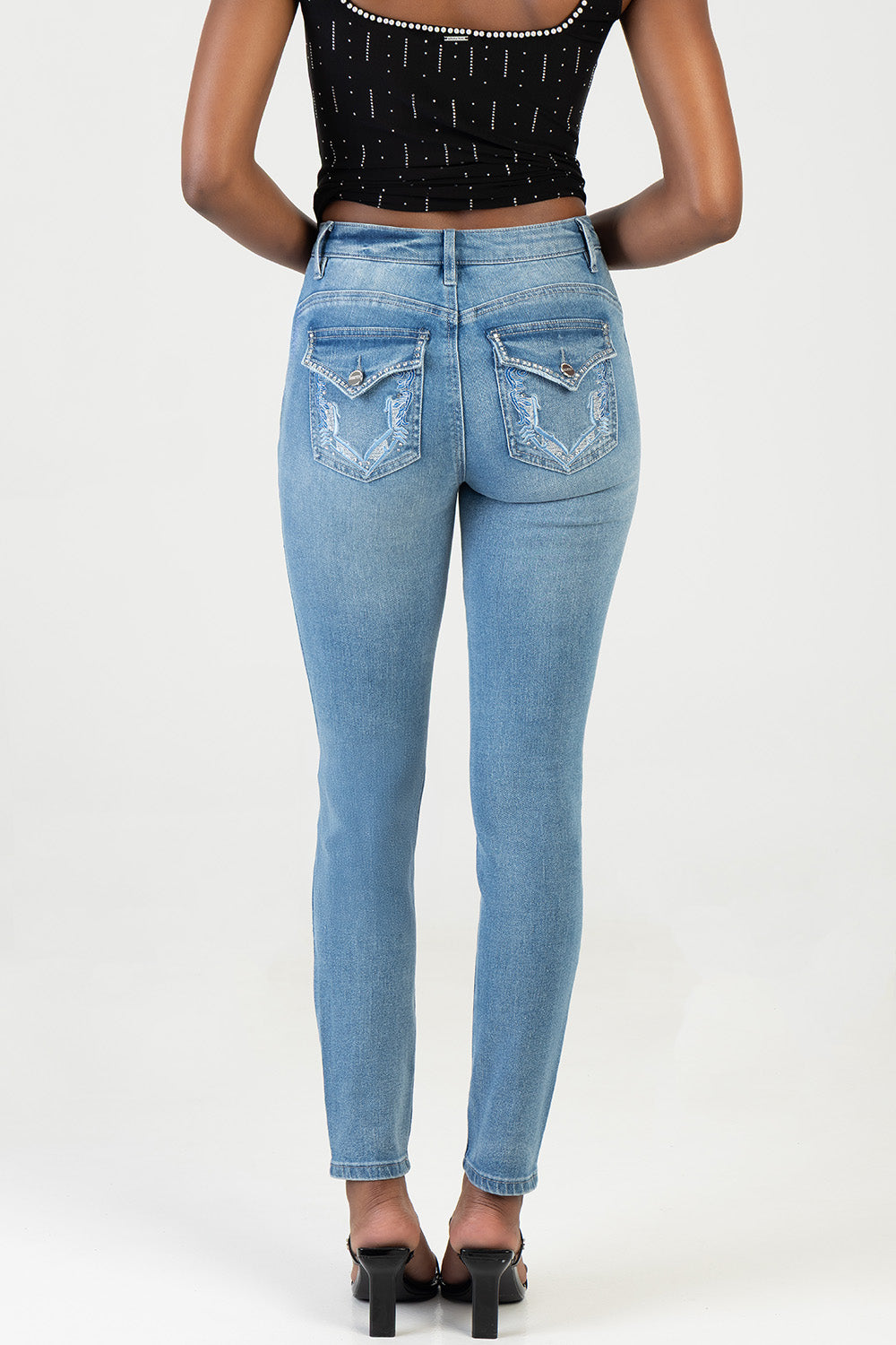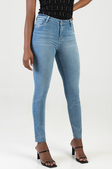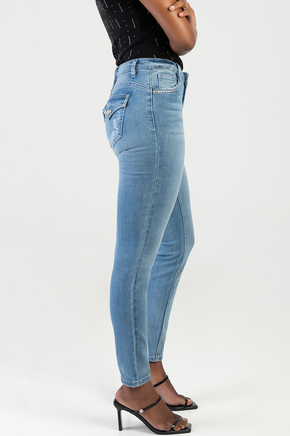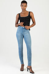 This mid-waist skinny offers a sleek, body-contouring silhouette with a modern edge. Designed to sit comfortably at the mid-rise, it creates a flattering, streamlined fit through the leg. Back pocket flaps add a subtle statement detail, enhancing the profile while elevating the classic denim look. A versatile essential that balances structure, comfort, and contemporary style.
