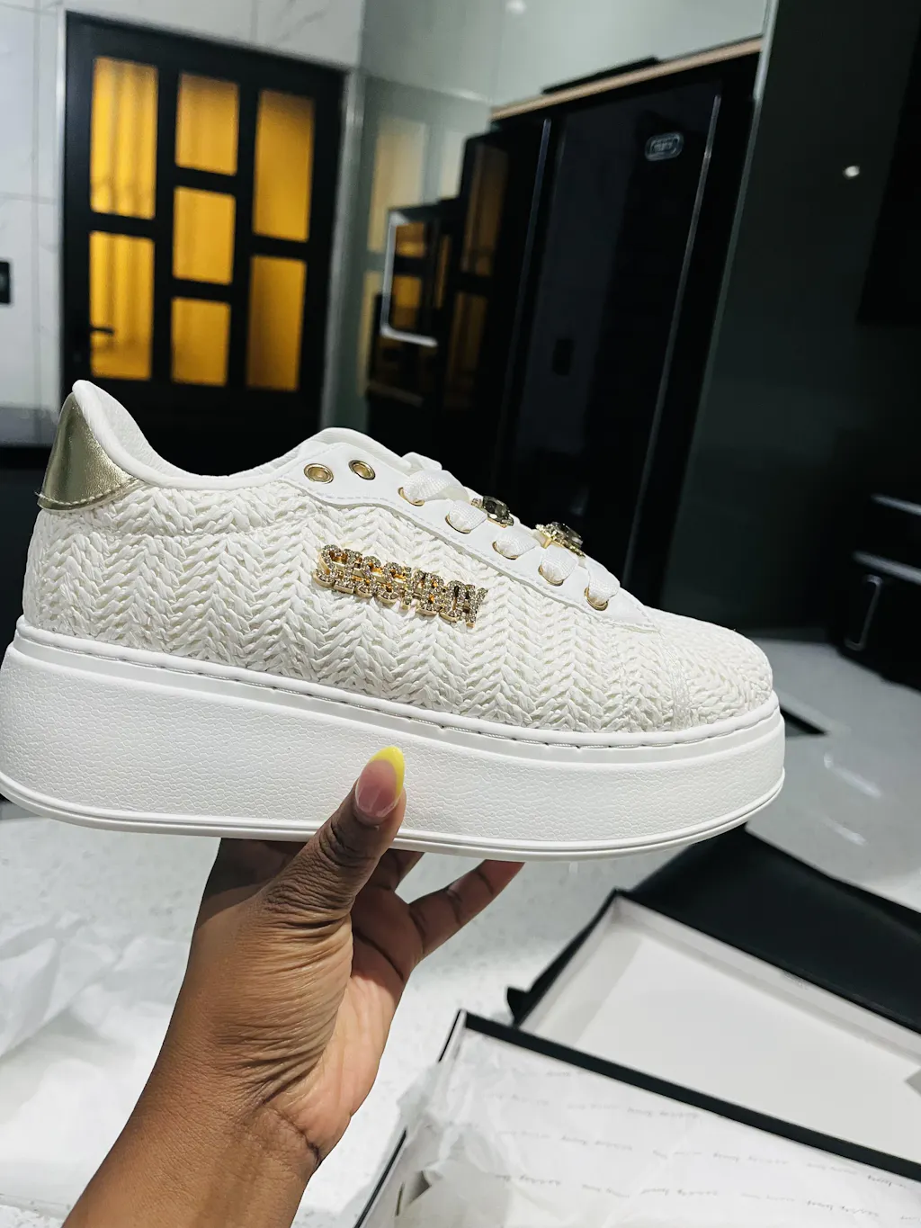 Woven Platform Sneaker with bling shoelace charms brings an effortless beachy tone with a touch of sparkle. The woven texture adds relaxed charm, while the platform design offers comfort and height for easy, all-day wear.