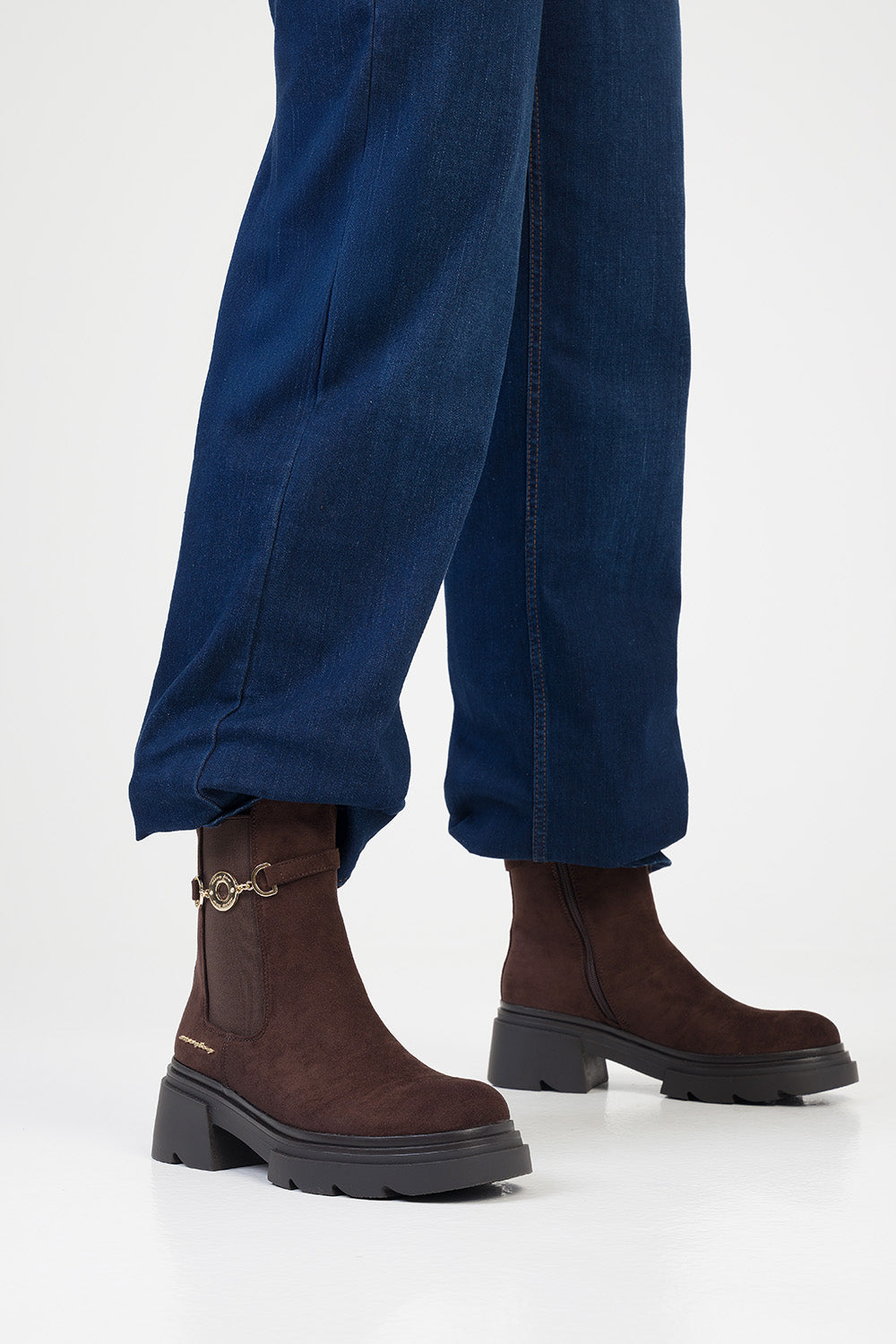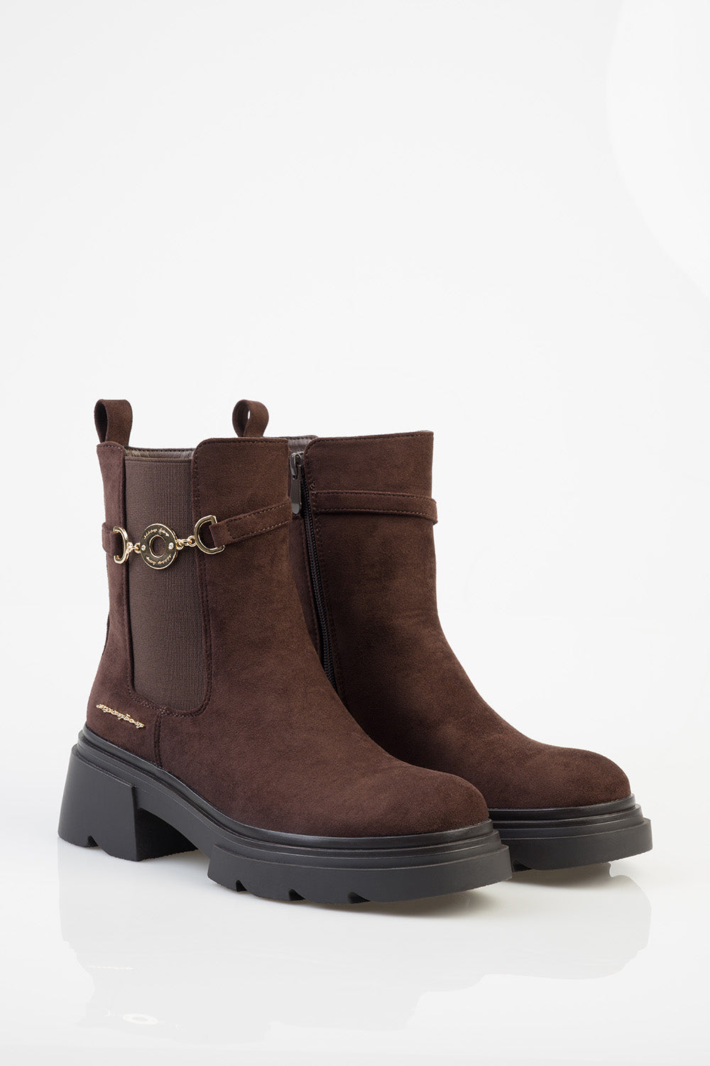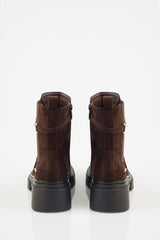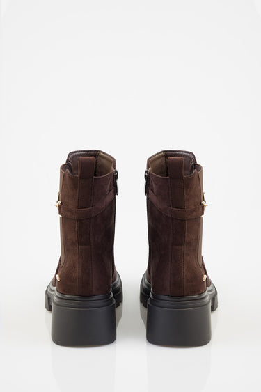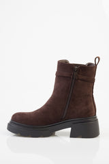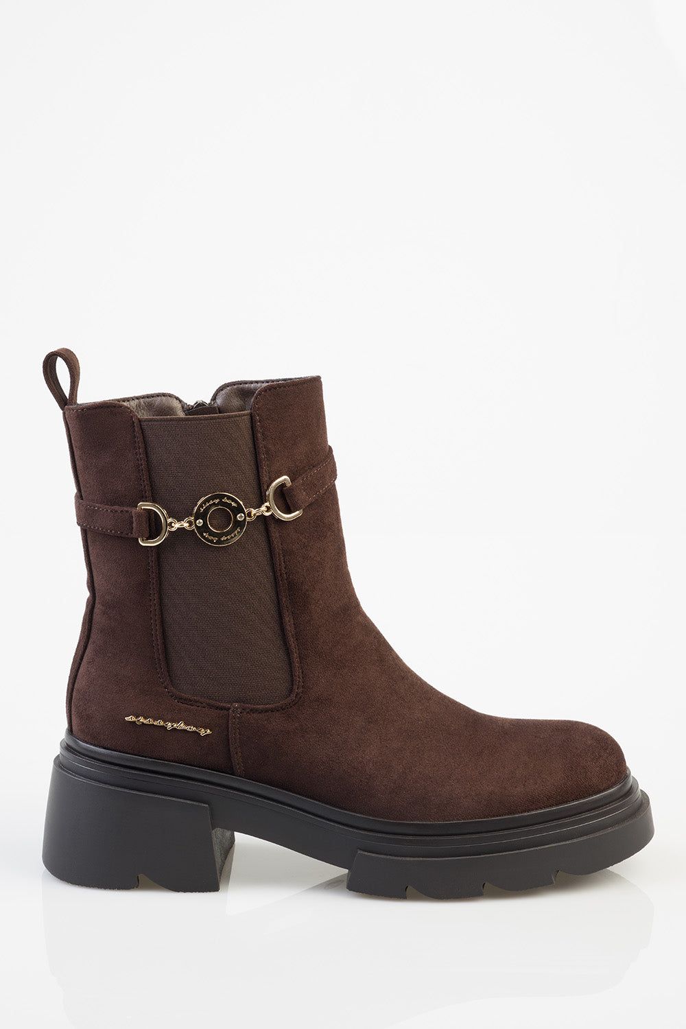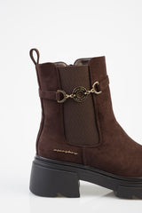 The Aly Ankle Boot is a brown Chelsea-style design with a matte finish. It features elastic side gussets, a pull tab at the back, and a decorative side strap with gold-tone buckle detailing. Set on a chunky black outsole, it offers a structured ankle-length silhouette with a durable tread.