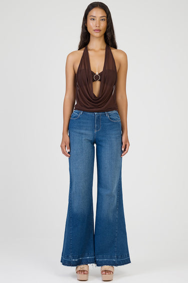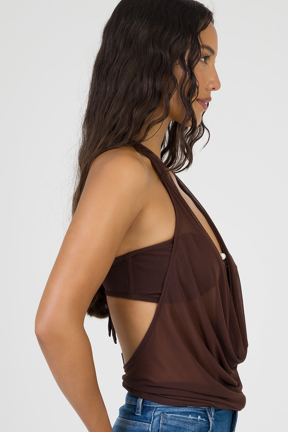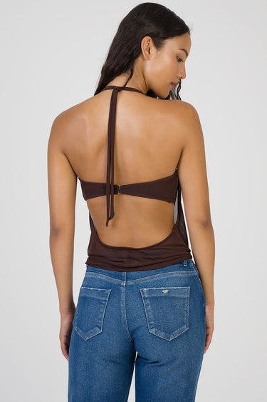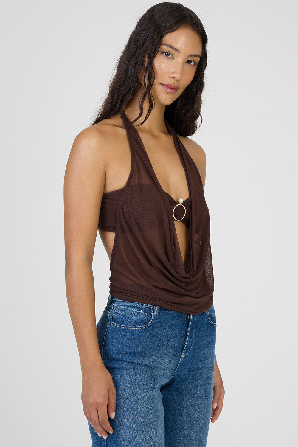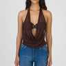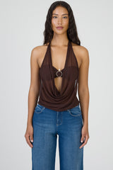 Sultry halter neck top crafted in sheer chocolate mesh, featuring a dramatic plunging cowl neckline and statement ring detail at the bust. The fluid drape creates a soft, feminine silhouette with effortless allure.