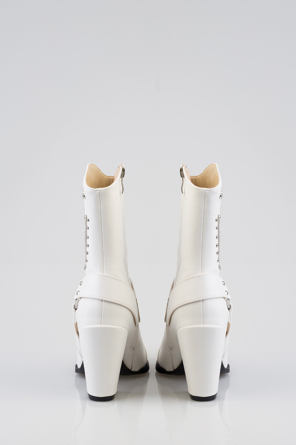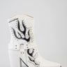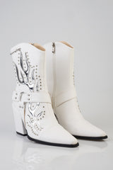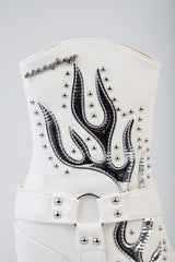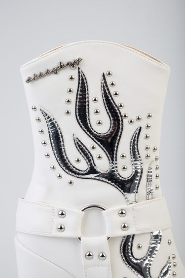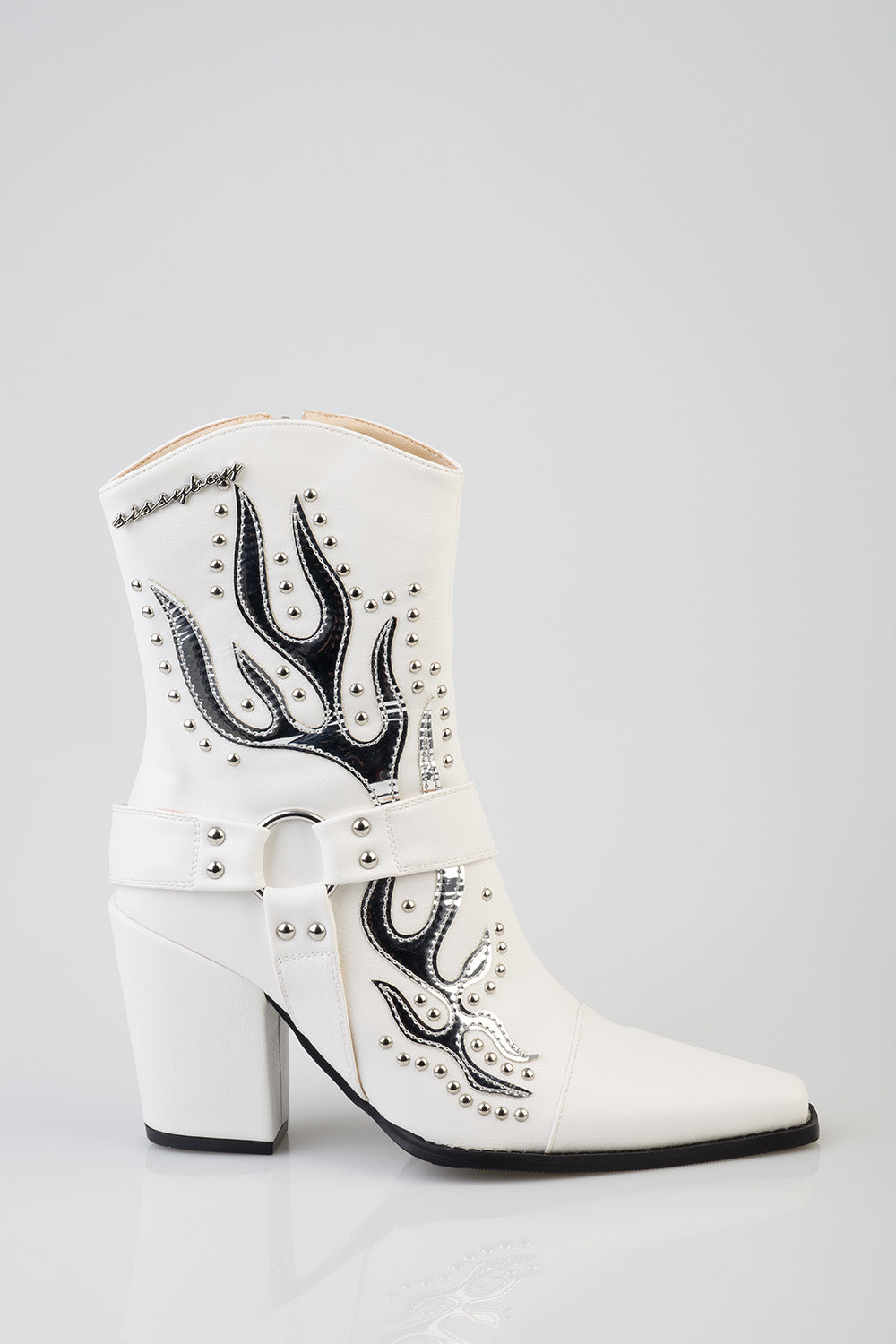 Bold Western ankle boot in smooth white finish, featuring striking silver flame appliqué and stud detailing. Complete with a statement strap, metal ring accent and sturdy block heel.