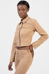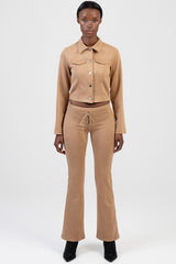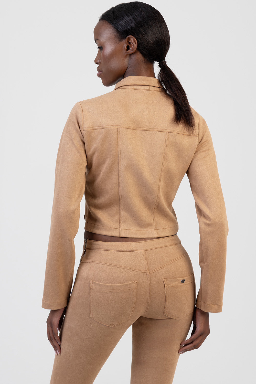 Blake faux suede jacket reimagines modern tailoring in a soft, camel-toned faux suede. Cut in a fitted, cropped silhouette, it features clean lines, mock flap details and press stud closures for a refined, minimalist finish. Style it with the matching Blake faux suede flare leg pants for an elevated, head-to-toe look.