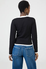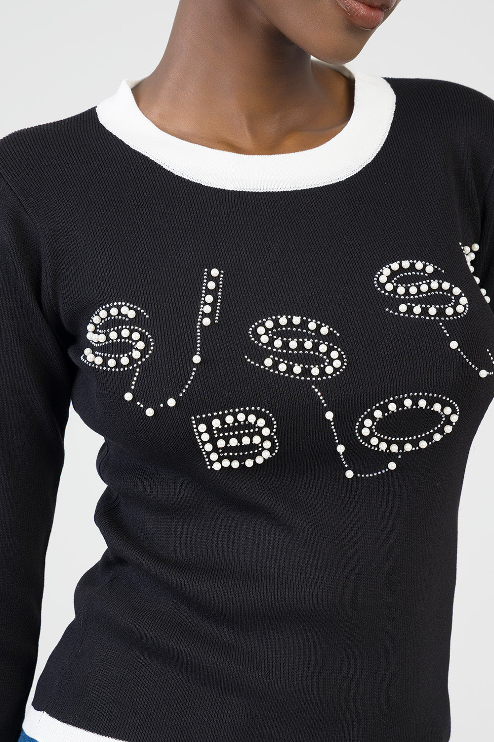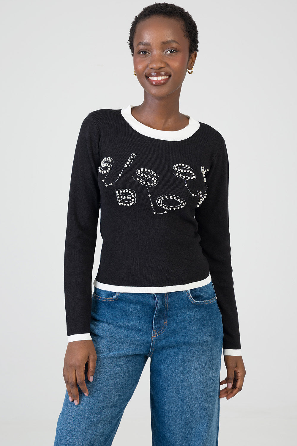 Long sleeve knit top featuring contrast tipping at the neckline and cuffs, finished with a shimmering bling logo. A sleek, comfortable piece that adds subtle sparkle to casual, everyday outfits.