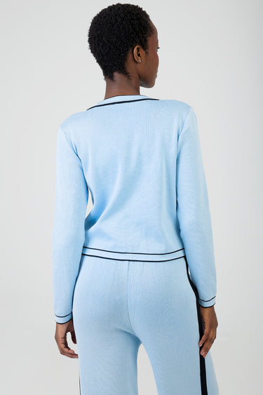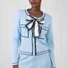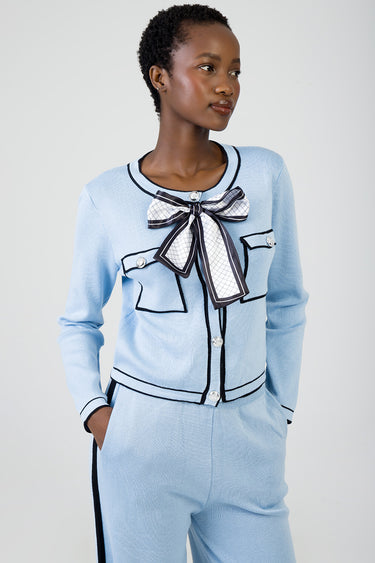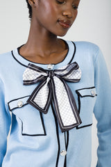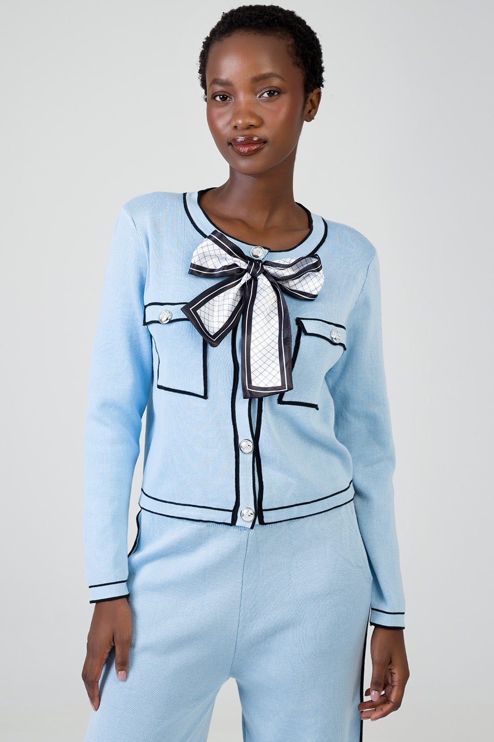 Chic light blue knit cardigan with contrast black tipping and statement button details. Designed with front pockets and a detachable bow scarf at the neckline for a polished, feminine finish.