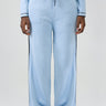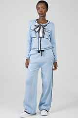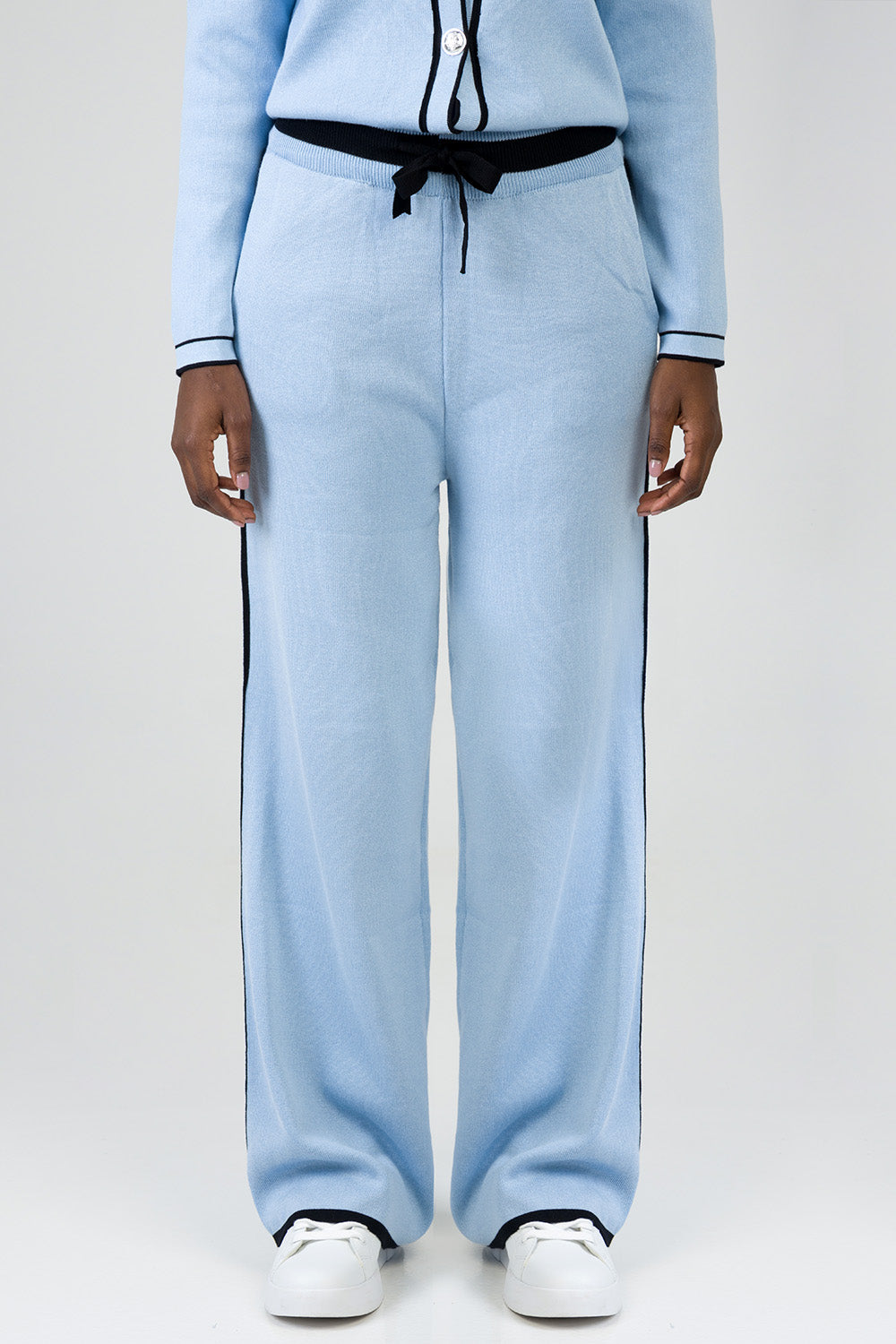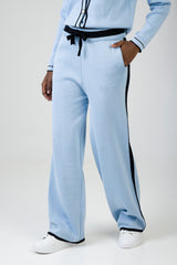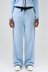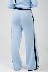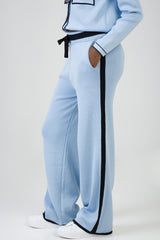 Soft light blue wide-leg knit pants with contrast black tipping along the sides and hem. Designed with a comfortable elasticated waistband and drawstring detail for a relaxed yet polished look.