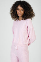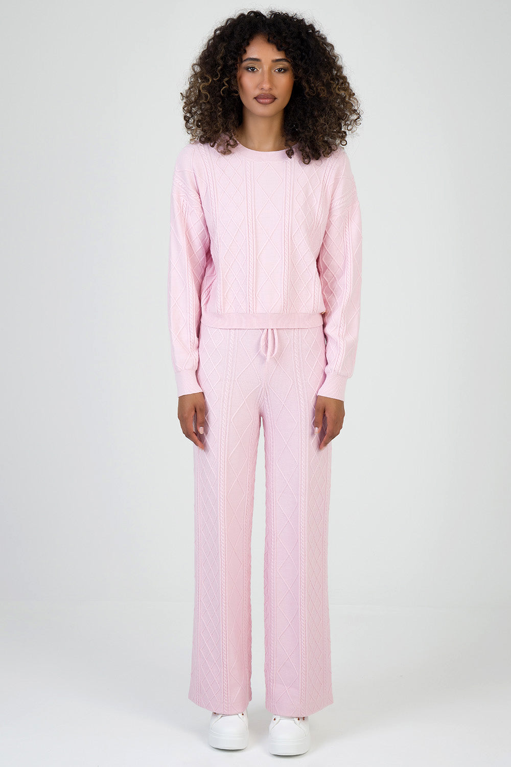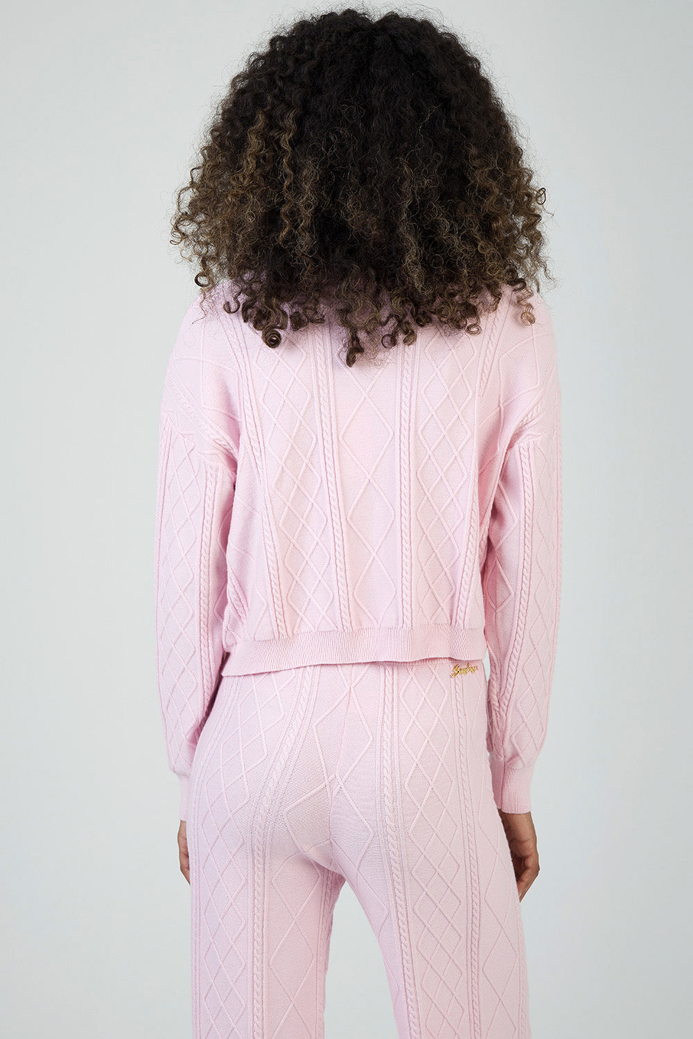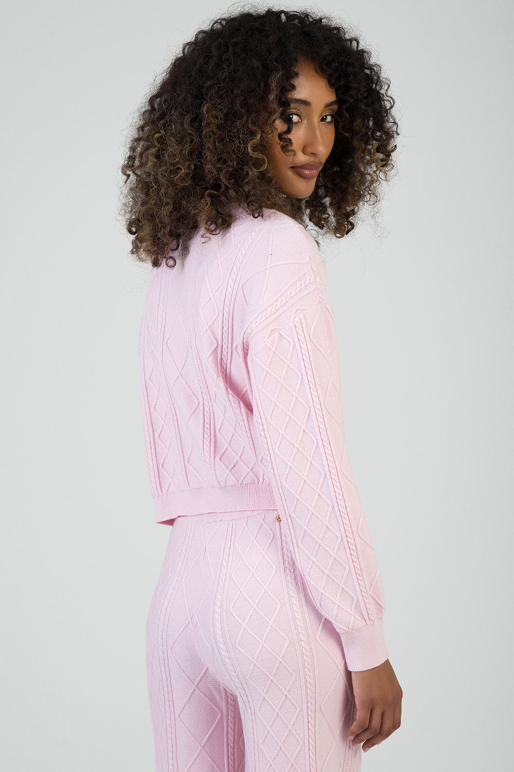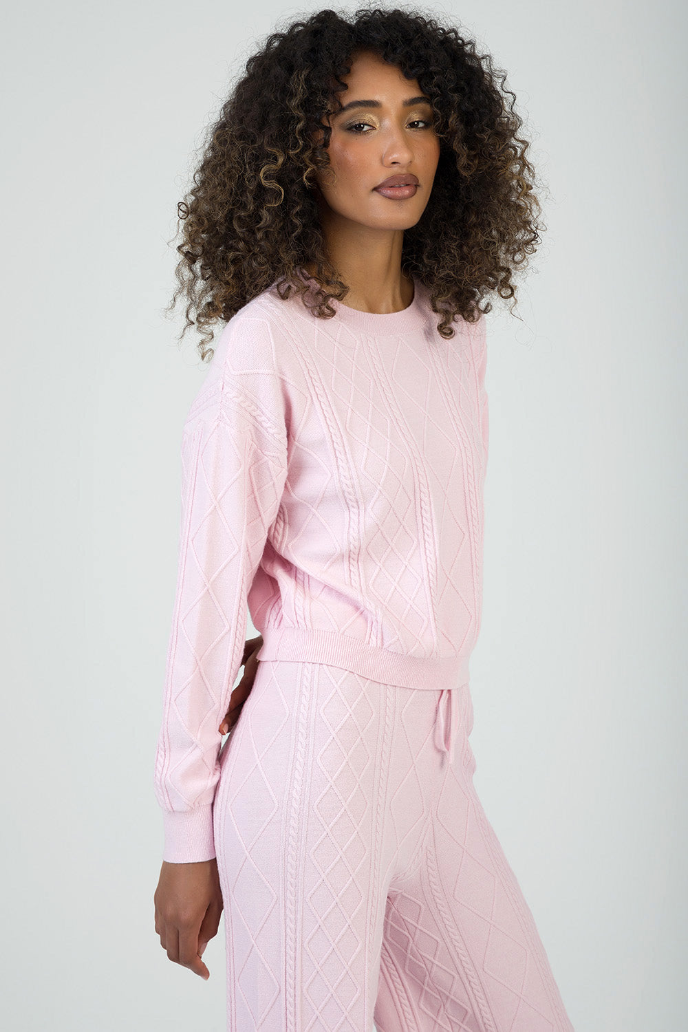 Soft pink boxy cable knit jersey with a relaxed fit and textured diamond pattern. Featuring ribbed cuffs and hem, it’s perfect for effortless layering and cozy, everyday style. A modern wardrobe staple.