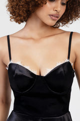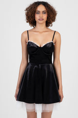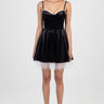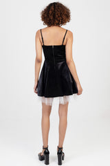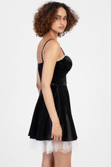 Head Over Heels Mini Dress is designed in a skater silhouette with a fitted bodice and structured cup detailing for a defined shape. Made from soft velvet, it features slim straps and a flared skirt with subtle trim, offering a clean, polished look suitable for both day and evening wear.