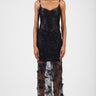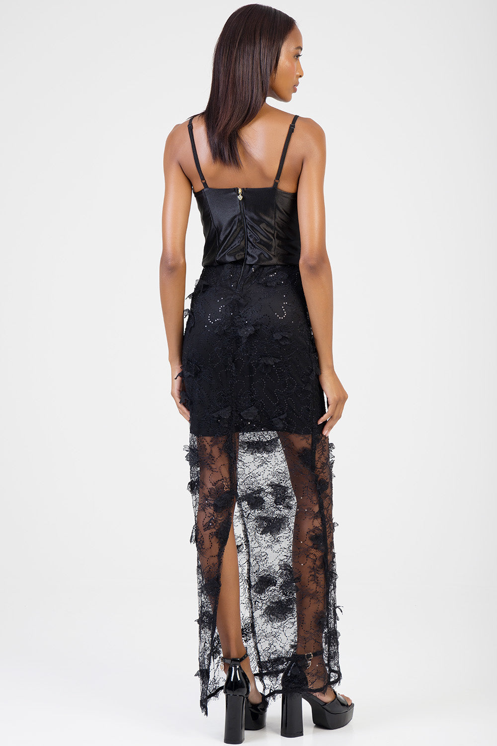 Elegant black maxi dress featuring a structured corseted bodice with delicate strap details. Finished with a sheer lace skirt overlay and intricate floral texture for a dramatic, feminine evening look.