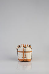 A mini bucket bag featuring tan trims and a debossed print, combining compact elegance with everyday functionality. Its structured shape and subtle detailing make it a versatile accessory for any outfit.
