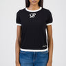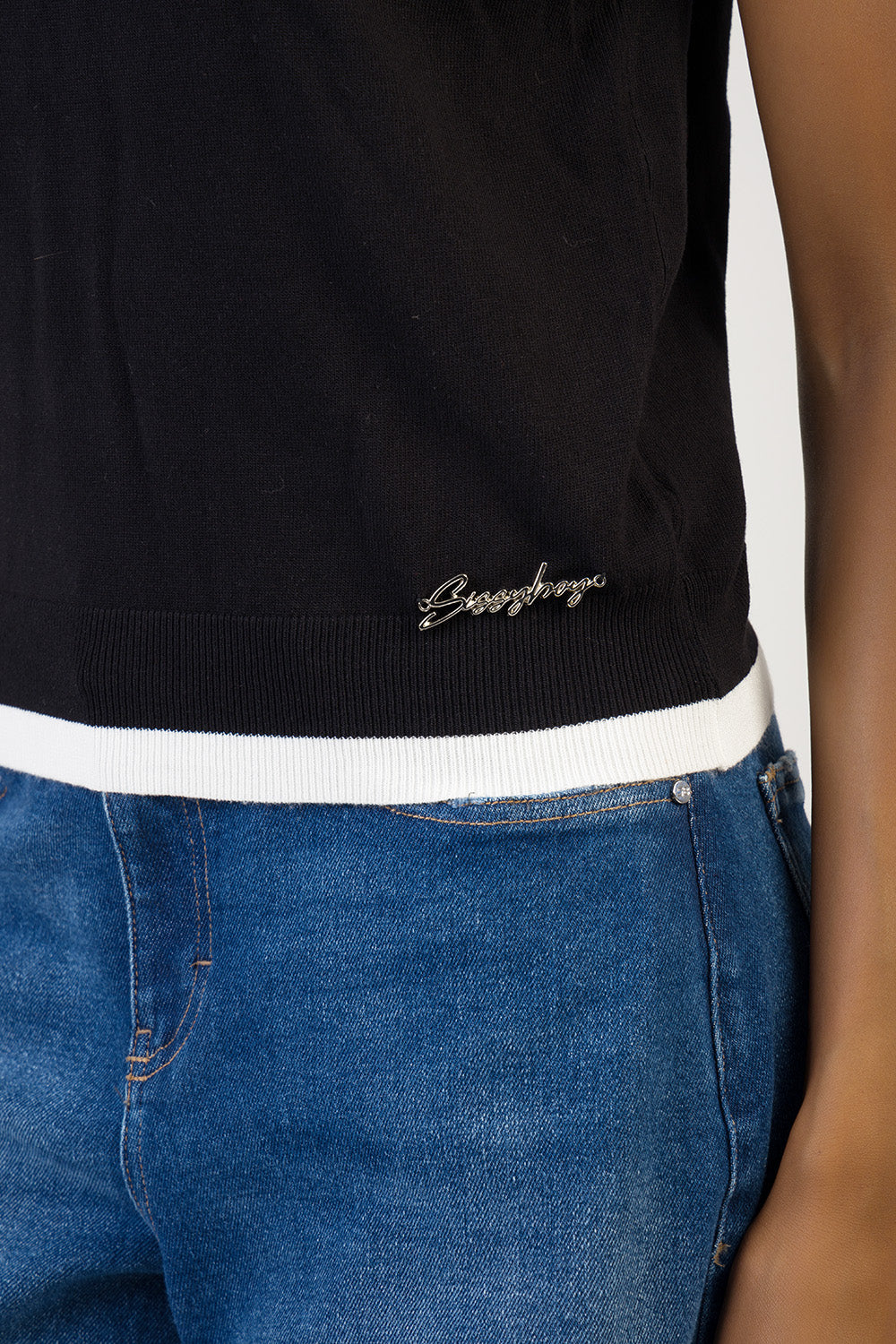 Chic short sleeve knitwear top in a classic black hue with contrast ribbed trim. Finished with a statement bling logo at the chest, it adds a touch of sparkle to effortless, everyday styling.
