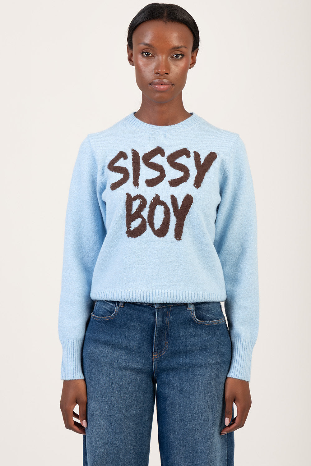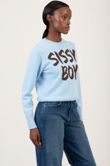 The Play It Cool Knit Sweater is a light blue knit designed with a classic crew neckline and ribbed trims at the cuffs and hem. It features a regular fit and a soft texture, finished with a bold contrast Sissy Boy logo across the front for a clean, branded look.