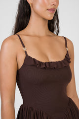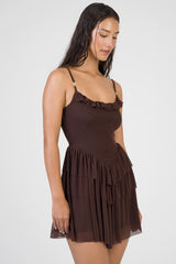 Chocolate brown mini dress with delicate ruffle trim along the neckline and layered gathered skirt. Features slim adjustable straps with gold-tone accents and a soft, sheer finish for a feminine, flirty silhouette.