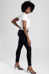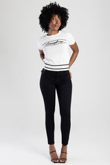 Robyn is a mid-waist skinny jean crafted from luxurious black sateen. Soft with a subtle sheen, it hugs the body for a sleek, flattering fit—perfect for day-to-night wear with heels, boots, or sneakers.