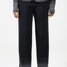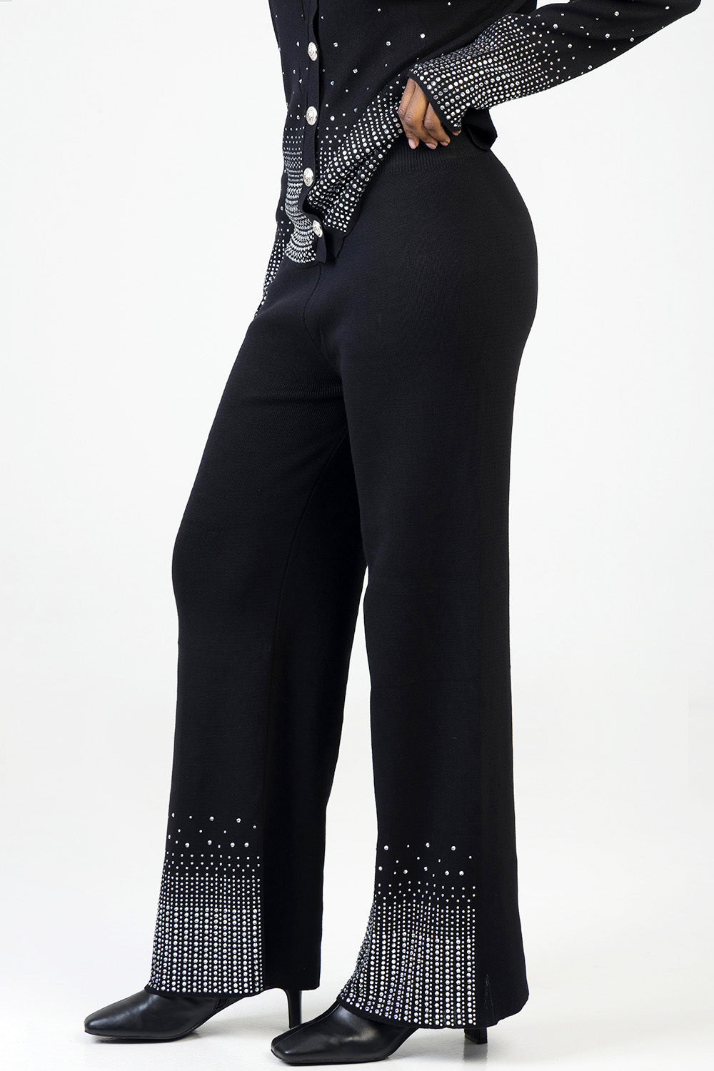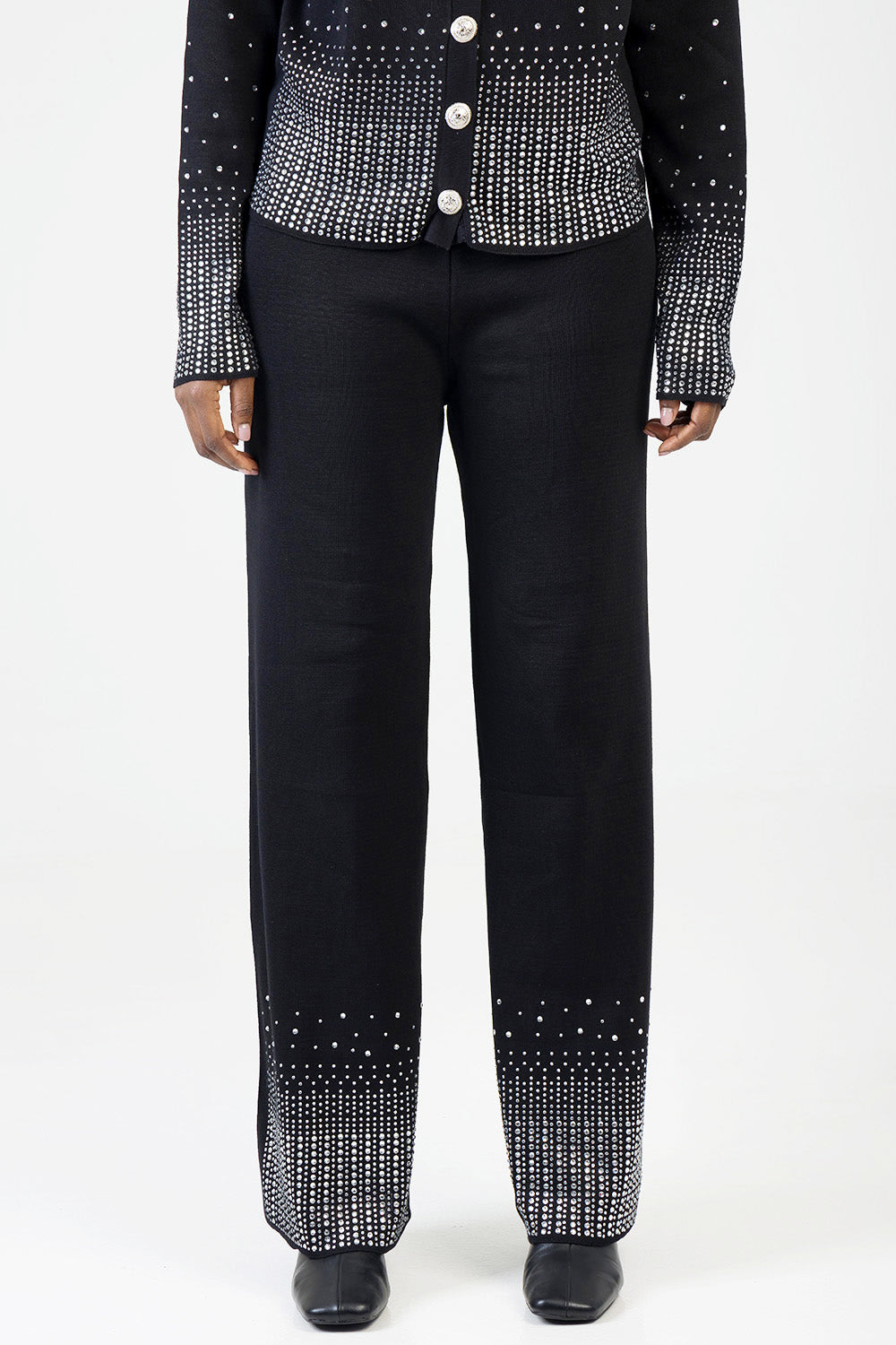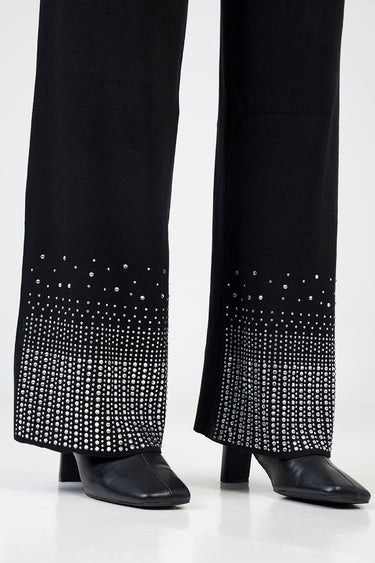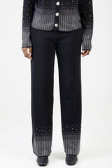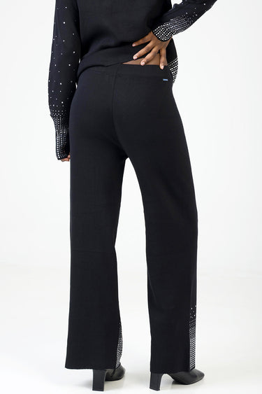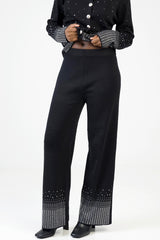 Chic knit pants adorned with shimmering rhinestones along the hems, offering a straight-leg fit and comfortable stretch. Perfect for elevating evening looks with a touch of sparkle and sophistication.