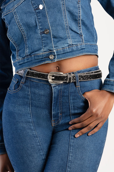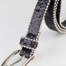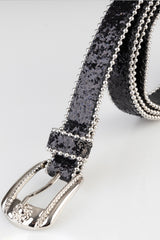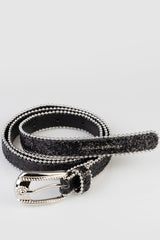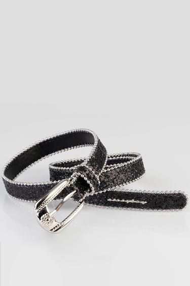 glitter skinny belt with small hardware ball trim and decorative hardware buckle