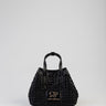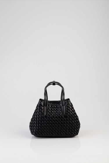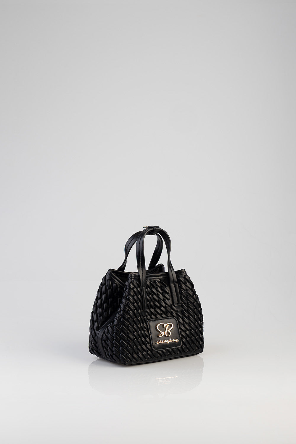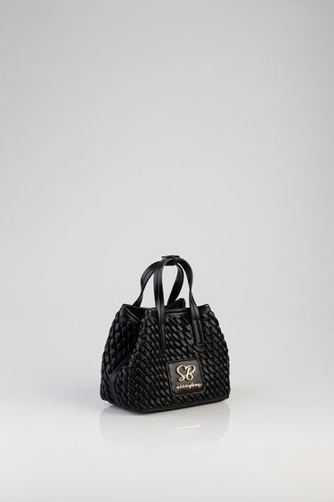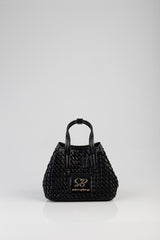 A woven mini tote bag featuring silver trims and a silver Sissyboy logo. The textured design adds a unique touch, while its versatile style makes it suitable for both formal occasions and casual outings.