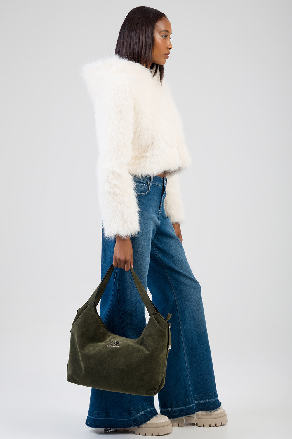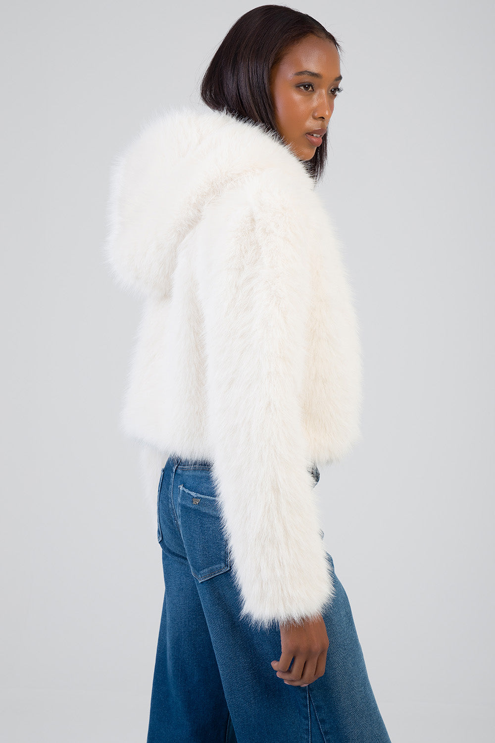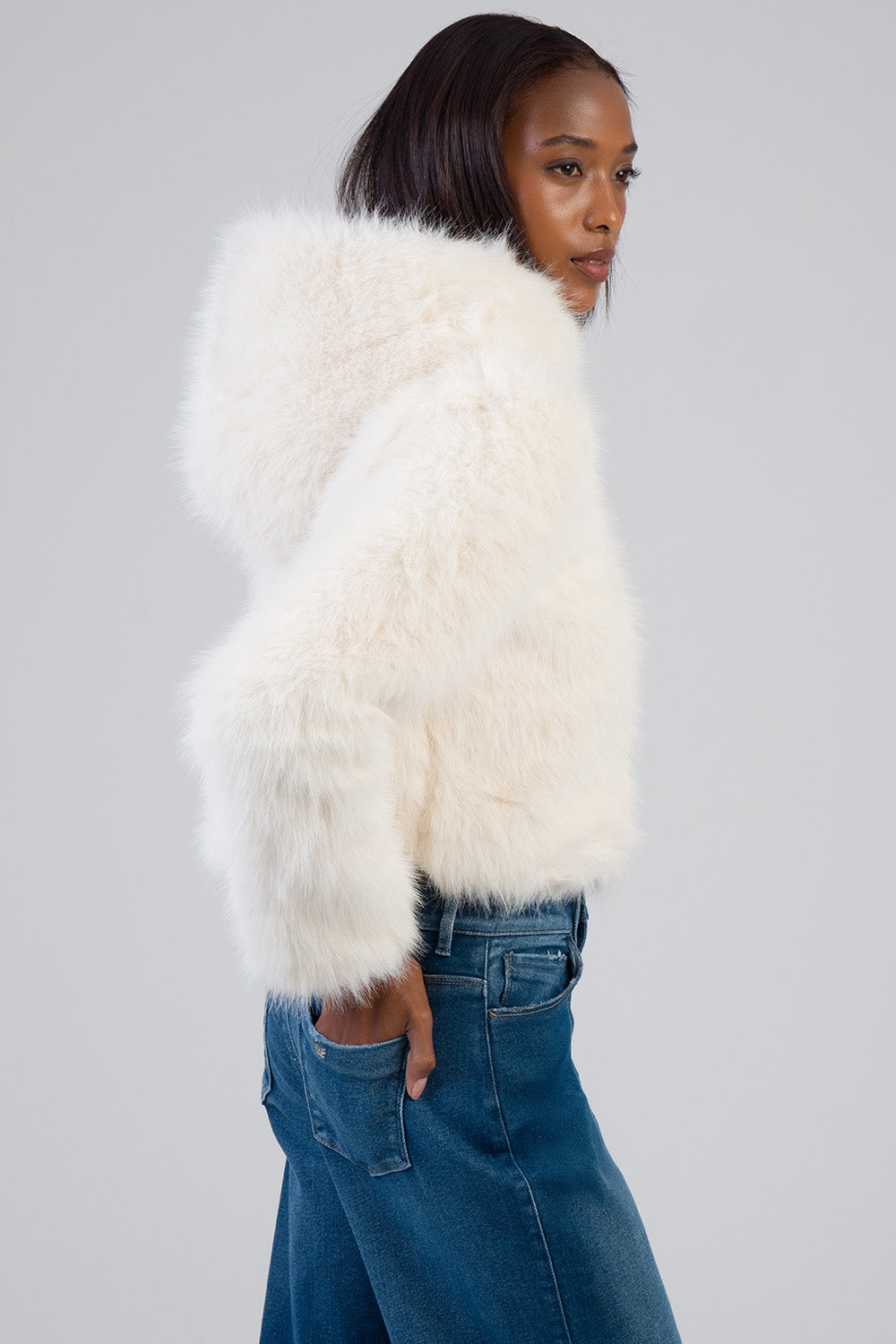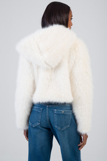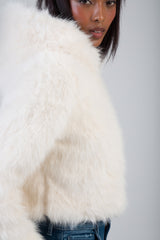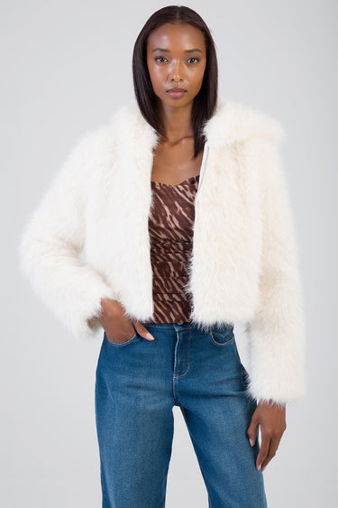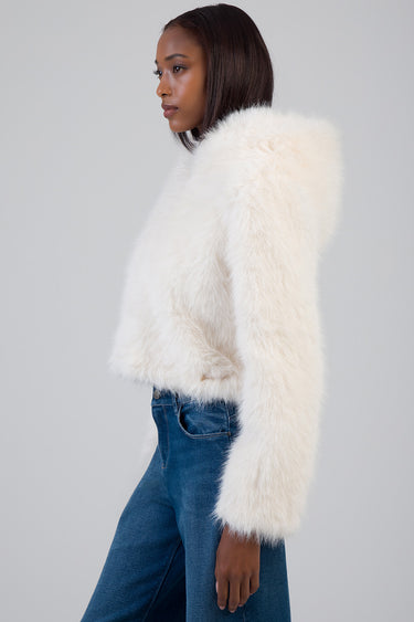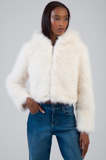 The Total Bliss Cropped Jacket is a cream faux fur outerwear piece designed with a clean zip-through front and attached hood. Cut to a cropped length, it features a soft, dense pile texture, full-length sleeves, and a relaxed fit. A versatile layering option for cooler weather with a structured silhouette.