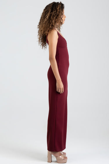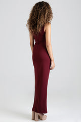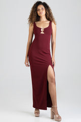 Elegant burgundy maxi dress with a sleek, body-skimming fit. Features a statement ring detail at the neckline and a thigh-high slit for a modern, sophisticated finish. Perfect for evening occasions.